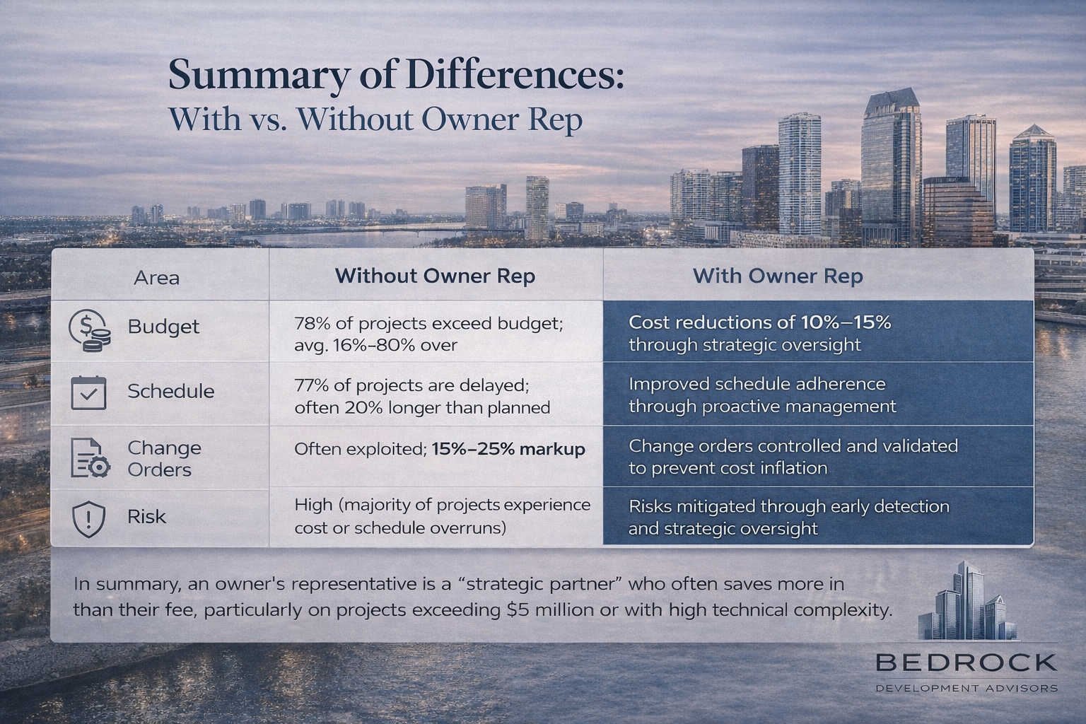 Bedrock Development Advisors provides experienced construction guidance for investors, developers, and property owners. With over 20 years of hands-on industry experience—from field supervision to project leadership—we help clients plan, manage, and deliver successful projects while protecting their best interests. Our focus is simple: strong planning, clear communication, and projects delivered the right way.